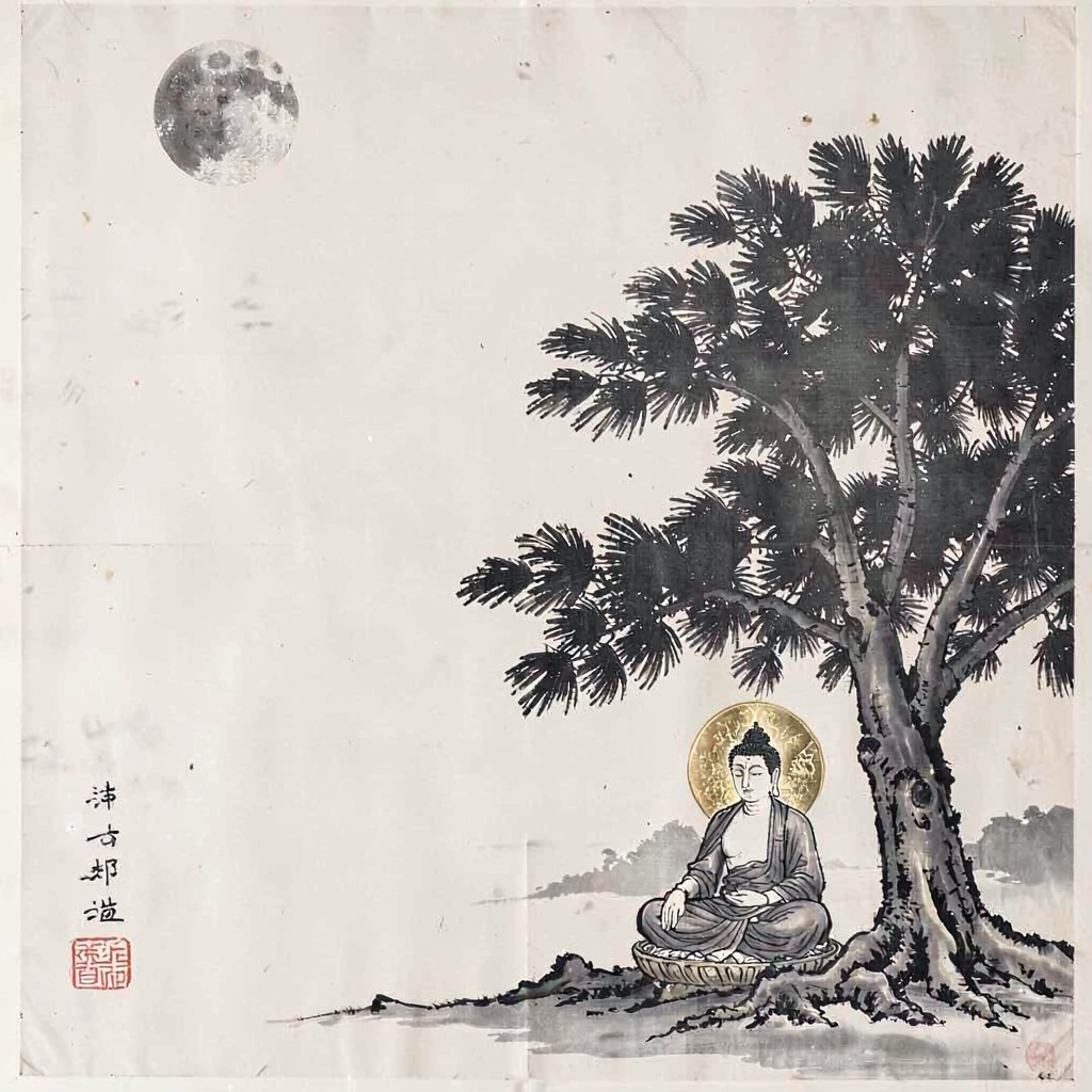 A motif of enlightenment arriving beneath a sacred tree — most prominently, the Buddha's awakening under the Bodhi tree. Compare with the Tree of Knowledge and the Tree of Life in the Abrahamic traditions, and the Ashvattha (cosmic fig tree) of the Bhagavad Gita.